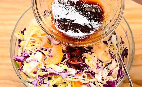 Whisk together the salad dressing ingredients in a separate bowl. Whisk together 3 tablespoons soy sauce, vinegar, garlic, ginger, oil, 1 1/2 teaspoons sesame oil, brown sugar and chili sauce.