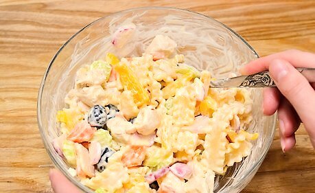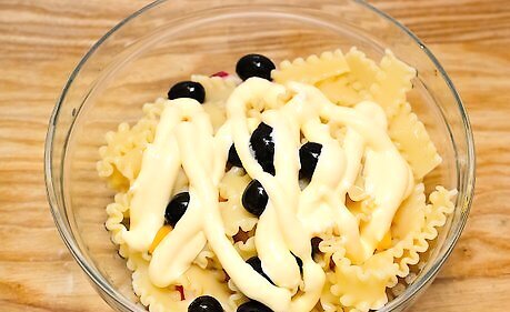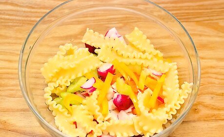 Put the noodles in a bowl when the noodles are cold and ready. The size of the bowl depends on how much stuff you're putting in it. Put the rest of the ingredients in and take out the mayo.
