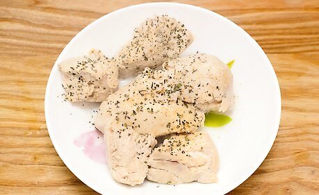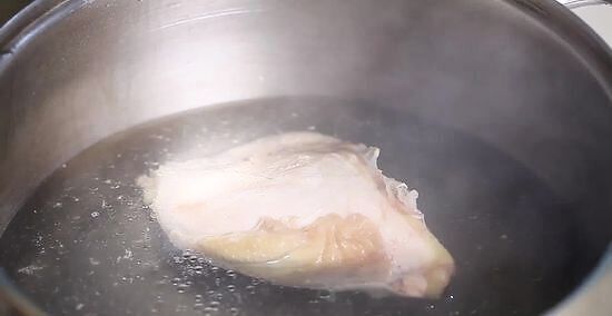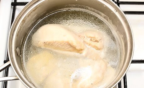 Boil the chicken. Bring a medium sized pot of water to a boil, and then place the chicken breasts inside. Reduce to a simmer, cover the pot, and allow the breasts cook for 15-20 minutes.