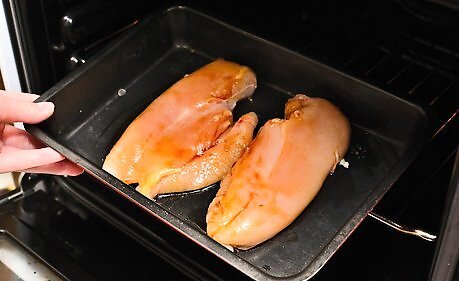 When oven is finished preheating, place chicken breasts in oven for 13 to 15 minutes, or until fully cooked through. Chicken meat will turn from pinkish to white when fully cooked; juices will run clear.