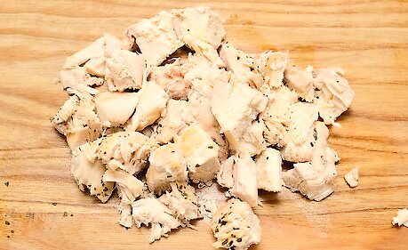 Strain the water from the pot and transfer the chicken to a cutting board. Once the breasts have cooled, chop them into small pieces.