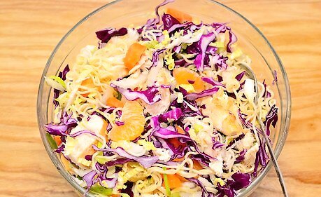 In a salad bowl, combine Napa cabbage, red cabbage, carrot, scallions, Mandarin orange, noodles, and sliced chicken.