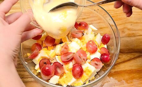 Combine chicken, eggs, grapes (or raisins), and dressing. Cover with plastic wrap and set into the refrigerator again to cool for at least 30, preferably an hour.