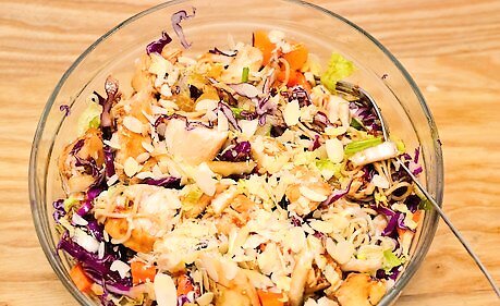 Gather your ingredients. Here's what you'll need to make a Chinese chicken salad: 4 tablespoons low-sodium soy sauce, divided 2 teaspoons toasted sesame oil, divided 1 pound skinless, boneless chicken breasts 1/2 head of Napa cabbage, thinly shredded (about 6 cups) 1/4 head red cabbage, shredded (about 2 cups) 1 large carrot, shredded (about 2 cups) 3 scallions, trimmed and thinly sliced, greens included (about 1/2 cup) 2 Mandarin oranges, peeled and chopped 6 ounces Chinese noodles, heated briefly to crisp 1/3 cup rice wine vinegar 1 teaspoon minced garlic 1 teaspoon minced ginger 2 tablespoons canola oil 2 tablespoons brown sugar 1 1/2 teaspoons chili-garlic sauce or chili sauce 1/4 cup sliced almonds, toasted