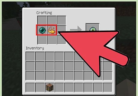 Select one Ender Pearl and one Blaze Powder from your inventory. These items will be added to the 3x3 crafting grid. Verify that the Ender Pearl and Blaze Powder are positioned correctly in the grid. The Ender Pearl must be placed in the middle box of the middle row, and the Blaze Powder must be placed to the right of the Ender Pearl in the middle row. These items must be placed correctly in the grid in this order to create the Eye of Ender. If necessary, move the Ender Pearl and Blaze Powder into their correct positions in the grid.