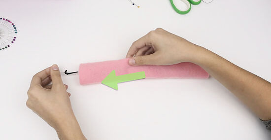 Add the elastic. The elastic will allow the headband to gently stay on your baby’s head, without constricting or requiring snaps or ties. It will also allow the band to grow with your baby, allowing her to wear it for longer. Be sure that you have enough elastic, as a too-tight band is not good for your baby. Feed the elastic through the tube. This will be easiest if you place a safety-pin at one end of the elastic and use that to guide you. Make sure that as you pull the elastic through the tube, the elastic remains flat. Sew the two ends of the elastic together by hand or by machine. A zigzag or x-shaped stitch is good for this. Be sure that the elastic is flat and did not twist inside the tube. Close the tube. While it is possible to use your machine, this step works best when using hand stitching. Tuck the ends of the fabric inward as much as possible. Use careful, small whip stitches to join the ends of the tube together. If you do not want to sew by hand, close the tube with your machine, overlapping the fabric and sewing a line down the back. This method will be more visible that hand-stitching. With the tube closed, now your band is done!