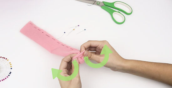 Create the tube. Now you will want to create the tube. This tube comprises the main section of the headband. It will go around the head and embellishments will be added to it. Make it as even as possible but since it is made of stretch fabric, most imperfections will be hidden naturally. Fold the rectangle of fabric. If you’ve chosen to use stretch lace, this will be unnecessary. If using other materials, fold it lengthwise so that the wrong side is facing outwards. Pin the material using straight pins, so that the long edges are in line with each other. Straight pins should be placed perpendicular to the long side of the fabric. This will keep your sewing machine from catching on a pin if you forget to remove one. It will also make it possible to sew right over the pins as well. Sew the length of the material, leaving your quarter to half-inch seam allowance and the ends open. Use a stitch and sewing machine needle appropriate to the material you have chosen. Stretchy fabrics will require a ball-point needle and a stretch or zigzag stitch. For plain cotton a normal needle and straight stitch should suffice. The same methods can be done by hand but will be more time consuming. Reverse the fabric. This can be done simply by hand but it may be easier to use basic tools. The most common method is to use a small safety-pin. Pin it at the end of the tub in such a way that the dead of the pin is inside the tube. Begin pulling small sections of fabric over the pin and pushing the head down the length of the tube. This takes time but is fair simple. When you are done you may wish to iron the tube flat, to create more of a band appearance. You may also wish to forgo ironing, in favor of a looser, draped look.
