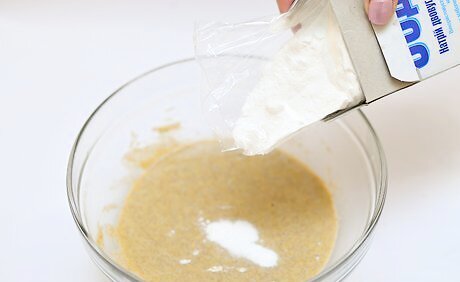 Add the remaining ingredients. In the morning, uncover the bowl. Add the final 2 tablespoons (26 g) of brown sugar, the baking soda, and the oil. Whisk the batter until all the ingredients have been incorporated. Oils you can use in this recipe include olive, vegetable, melted coconut, canola, or melted butter.