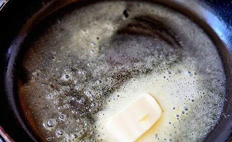 Preheat the griddle. Add the butter to a large griddle and heat it over medium heat. Let the butter melt and the griddle warm for a few minutes. Drop a pea-sized dollop of batter into the butter. When the batter starts to sizzle, the griddle is ready. As you're cooking, you may need to add more butter between batches.