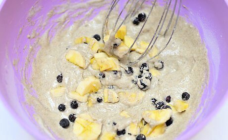 Add the banana and berries. Transfer the blueberries and banana slices to the batter. With a rubber spatula or wooden spoon, fold the fruit into the batter. Folding is a gentle method of stirring that will protect the banana and blueberries from getting crushed or mashed. Instead of blueberries, you can use any combination of blackberries, sliced strawberries, raspberries, currants, or other fruit.