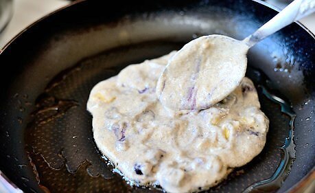 Making Vegan Banana Blueberry Buckwheat Pancakes