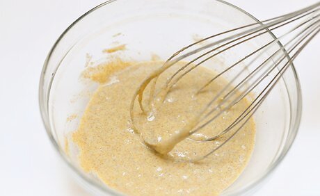 Add the dry ingredients to the wet. Sprinkle the dry ingredients over top of the wet ingredients. Use the whisk to mix everything together, and keep whisking until you have a thick, smooth batter. When the batter is ready, set it aside for five minutes. This will give the starch molecules time to absorb the liquid, and will make for a uniform pancake.