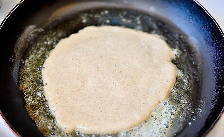 Preheat a griddle. Add vegan butter, margarine, or even coconut oil to a large griddle. Heat the griddle over medium heat. Add a pea-sized drop of batter to the griddle, and let the griddle preheat until the batter starts to sizzle.