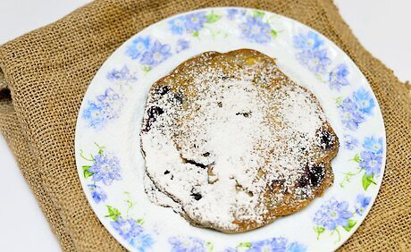 Cook the pancakes. Drop the batter into the heated griddle by the ¼ cup (59 ml), making sure that each scoop has some banana and blueberries. Cook the pancakes two or three at a time, depending on the size of your griddle. Cook for three to four minutes on the first side, and flip the pancakes when the bubbles on the surface start to pop. Cook the pancakes on the other side for an additional two to three minutes. Add more oil or margarine between batches if necessary, and continue until all the pancakes are cooked.