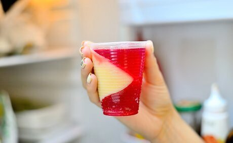 Let the shots set in the fridge for several hours. After you’ve added the final layer to the shot glasses, place them back in the refrigerator one last time. Allow the gelatin to set fully by chilling the glasses for 2 to 3 hours or overnight. Once you’ve added the final layer to the shot glasses, you don’t have to chill them on an angle any more.