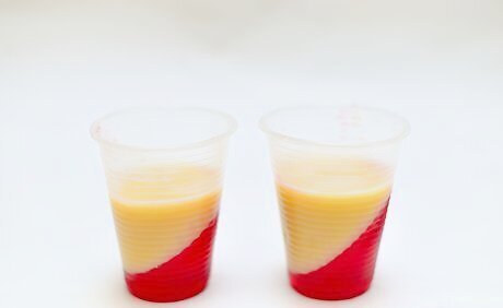 Add some of the white gelatin to each glass and chill again. When the first red layer is partially set, spoon some of the white gelatin mixture into the glasses over the red. Again, aim to place about 2 teaspoons (10 ml) of the white gelatin in each glass. Place the muffin tin back in the fridge for 20 minutes so the white gelatin can partially set.