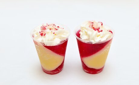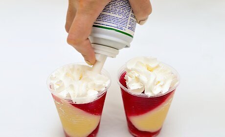 Add some whipped cream to the top of each glass. When the candy cane jello shots are completely set, add a spoonful of whipped cream to each glass. You can add just a dollop or create a large mound for a more impressive look. You can use either canned or homemade whipped cream to garnish the shots.