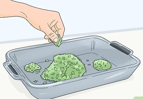 Spread the chopped catnip out in an even layer in a glass casserole dish. Dump the catnip from the cutting board into the middle of a casserole dish. Use your hands to spread it out all over the bottom of the dish in an evenly distributed layer. You could also use a metal baking pan with high sides if you don’t have a glass casserole dish.