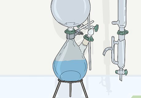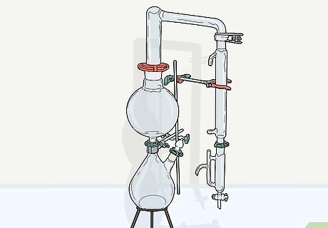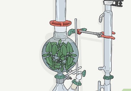 Fill the bottom chamber of the distilling apparatus halfway with water. Pour cold water from a tap into your home distilling pot or fill up the bottom chamber of your chemical distilling apparatus. Only fill the pot or chamber about halfway. If you have a home distilling system that only uses 1 pot, rather than pumping steam from 1 pot into a second pot, you can place a steam rack into the distilling pot to set the catnip on and hold the plant matter above the water.