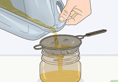 Strain the cooled oil into a mason jar. Place a fine mesh strainer over the mouth of a mason jar. Carefully pour the oil through it into the jar to strain out the plant matter. A fine mesh strainer is best for this because it won’t absorb any of the oil, as something like a cheesecloth would.
