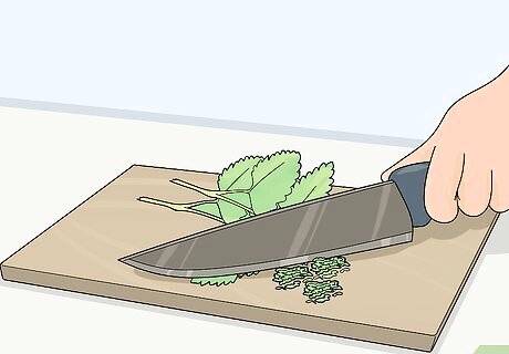 Chop the catnip leaves and stems up finely. Place the catnip you collected on a large cutting board. Use a sharp chef’s knife to finely chop the plant. This will expose more surface area so the olive oil gets infused with more of the oil from inside the catnip plant. Wash the catnip off if it is dirty or if you are unsure whether there may be pesticides on it. Let it dry completely before you use it to infuse the oil because water can explode in hot oil.