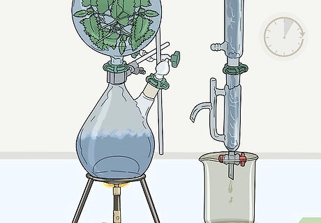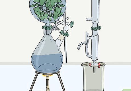 Acquire a steam distilling apparatus. Use a homemade distilling apparatus if you already have experience distilling and have your own setup. Purchase a lab-style distilling apparatus consisting of 2 beaker chambers and a condenser tube if you do not have your own equipment already.Warning: If you don’t have any experience with distilling, don’t attempt to make your own distilling apparatus out of a pressure cooker or other home items for this project. You could cause an explosion and injury. This method uses a distilling apparatus to pass steam through plant matter from a catnip plant, which causes the oils in the plant to evaporate and mix with the steam. You can then collect the condensation from the steam and separate the oil from it.
