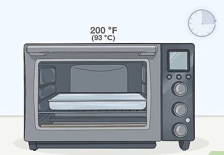 Heat the mixture in an oven at 200 °F (93 °C) for 2-3 hours. Set your oven to “bake” and set the temperature to 200 °F (93 °C). Put the casserole dish with the catnip and olive oil into the oven and leave it for 2-3 hours.Tip: Keep in mind that your home will smell strongly of catnip while you heat the mixture. Open up windows and doors to ventilate your space as much as you can. Don’t set the oven any higher than 200 °F (93 °C) or you can burn the mixture and ruin it. You don’t need to preheat the oven because you aren’t cooking the catnip.