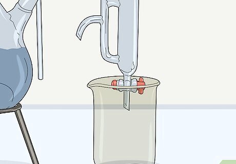 Put the distilling apparatus over a burner and boil the water. Place your distilling pot or chemical distiller over a stovetop burner or a bunsen burner. Turn the burner on to high heat and wait for the water to boil. Once the water boils, it will start generating steam that passes through the catnip and goes through the condenser tube on the other side into the collection vessel. Be careful around the burner and avoid touching the distilling apparatus after you start heating it up.