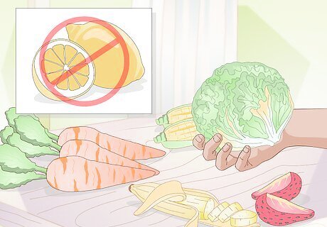 Purchase a variety of fruits and veggies. Visit your local grocery store or farmers market and purchase some fresh fruits and vegetables. (Organic produce is best, if possible.) Pick up some lettuce, kiwifruit, banana, bell peppers, grapes, strawberries, blueberries, or any other fruits and veggies you like. Wash them thoroughly, and cut them up into very small pieces. Hermit crabs don't like the taste of citrus fruits like lemon and lime and will probably not eat them. They also don't like herbs (peppermint, rosemary). They tend to avoid "Prunus fruits" or "stone fruits" (cherries, apricots, plums).