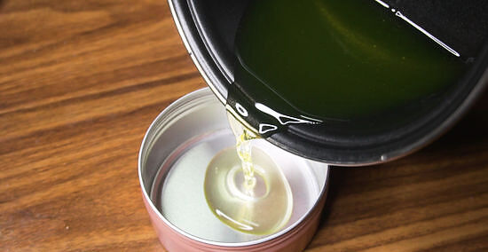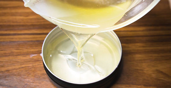 Pour your mixture into a 3 oz (120 g) or larger storage container. This combination yields about 2-3 oz (60-120 g) of solid cuticle cream. Locate a small aluminum tin or glass jar with an airtight lid, and scoop the cream into it with your spoon. A small mason jar makes a cute, decorative choice. If the bottle has a narrow top, place a funnel at the top to easily pour your mixture inside.