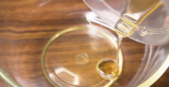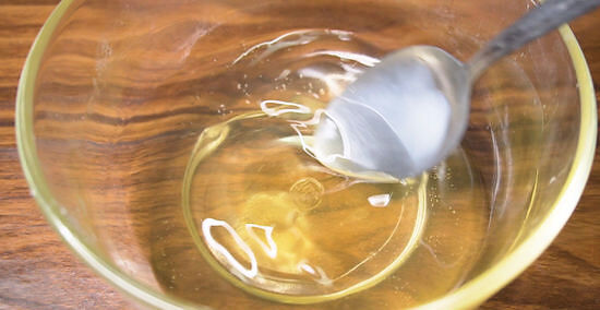 Pour 1 tsp (5 g) honey and 3 tbsp (45 mL) of carrier oil into the beeswax. If your carrier oil is colder than room temperature, heat it up for 10-30 seconds in the microwave. If you use cold oil, the beeswax may solidify. Then, pour it into the bowl with your beeswax. Scoop a heaping spoonful of honey to get about 1 tsp (5 g). For the greatest benefits, use raw (unpasteurized) honey.