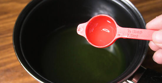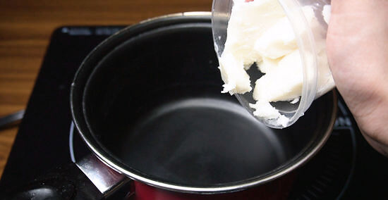 Melt your beeswax and butter in a small saucepan. Heat up a small saucepan on medium heat, then place 1 tbsp (15 g) of cocoa butter, 3 tbsp (44.4 g) of Shea butter, and 0.5 tbsp (7.4 g) of raw beeswax inside. As the mixture heats up and liquifies, stir it with a wooden spoon consistently. Your mixture should be ready in about 3-5 minutes. You can also heat the mixture in the microwave. Use 30-second intervals to prevent your mixture from overheating or boiling over.