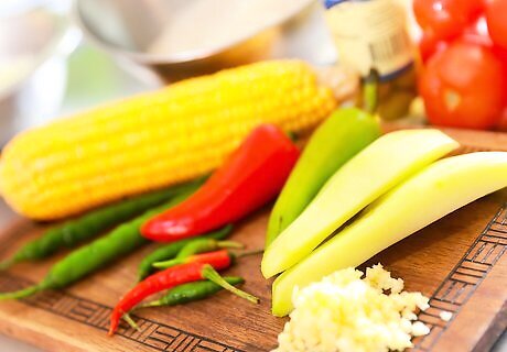 Gather the ingredients for making spicy Spanish rice. Here are the ingredients that you'll need: 1 diced red bell pepper 1 diced poblano pepper 1 diced jalapeño pepper 1 diced serrano pepper 1 shucked ear corn 1 tbsp. canola oil 1 diced yellow onion ½ diced yellow bell pepper 1 peeled and diced chayote squash 1 tsp. salt 1 tsp. cracked black pepper ½ tsp. cayenne pepper 6 minced cloves garlic 2 cups basmati rice 5 cups chicken stock ¼ cup chopped Spanish olives ½ cup canned black beans ½ cup diced tomatoes 1/3 cup chopped cilantro