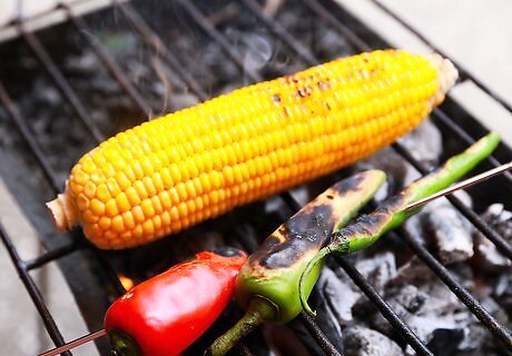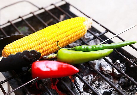 Char the vegetables, turning them frequently. Continue to do this until the corn starts to brown a bit and the peppers have blistered. As the smaller peppers finish cooking first, place them in a small paper bag and close it.