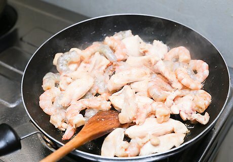Add the chicken and shrimp to the hot oil. Cook them for about 5 minutes. They will continue to cook as you add the other ingredients.