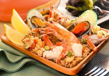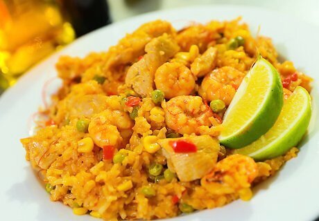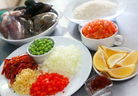 Gather the ingredients for making spicy Spanish rice. Here are the ingredients that you'll need: 1 tbsp. olive oil 1 sliced chorizo sausage 1 chopped onion 2 crushed garlic cloves 1 seeded and sliced red capsicum 2 cups long grain rice 1 tsp. paprika 1 pinch saffron 2 ½ cups chicken stock 400 g. diced tomatoes 300 g. seafood (mussels, prawns, calamari, salmon, halibut) ½ cup frozen peas lemon wedge