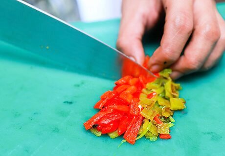 Dice the peppers once they've cooled. Wait a few minutes for the peppers to sweat and to cool off, and then dice them into thin square pieces.