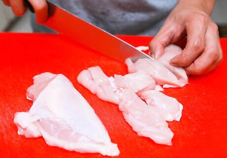 Chop 3 boneless chicken breasts. Use a sharp knife to cut strips that are about 1 inch (2.5 cm) wide along the length of each chicken breast.