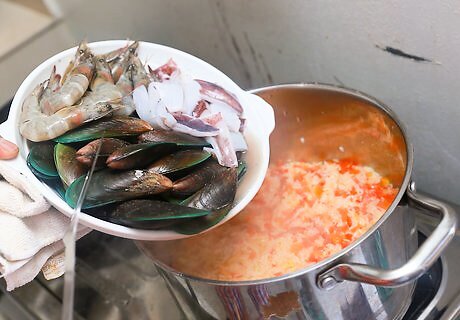 Add the seafood to the ingredients. You can choose any seafood you like as long as it totals around 300 g. The best seafood for this Spanish rice is prawns, mussels, calamari, and salmon, but you can also add crab, halibut, or any of your favorite seafood.
