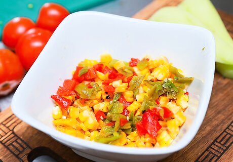 Combine the peppers and corn together. Place them in a small bowl and stir them. Set this bowl aside for later.