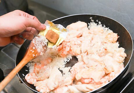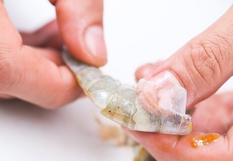 Peel and devein 3 lbs. of large shrimp. To do this, simply peel the skin off the shrimp, starting with its head. To devein the shrimp, make a ¼ inch cut into the bag of the shrimp, and pull out the dark vein running along the length of the back of the shrimp. If you can't see or find the vein of one shrimp, just move on to the next one.