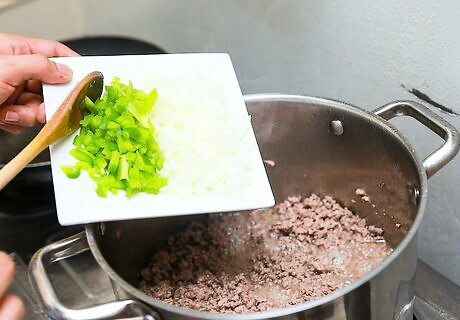 Add 1 medium chopped onion, 1 chopped green pepper, and 1 minced garlic clove to the beef and oil and stir the ingredients together.