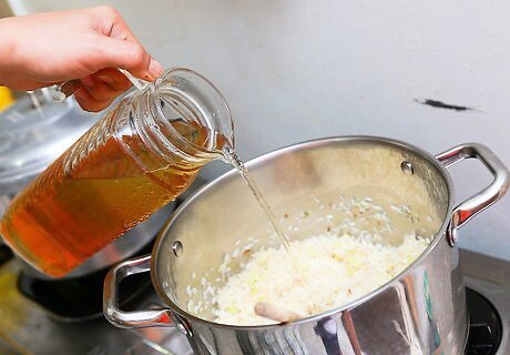 Stir in and sauté 6 minced garlic cloves and 2 cups of basmati rice for 3–4 minutes.