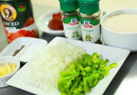 Gather the ingredients for making spicy Spanish rice. Here are the ingredients that you'll need: 1 lb. ground beef 1 medium chopped onion 1 chopped green pepper 1 minced garlic clove 1 can (14-½ ounces) stewed tomatoes 1-½ cups water 1 cup uncooked long grain rice 1 tsp. salt 1 tsp. chili powder ½ tsp. dried thyme ¼ tsp. dried basil ¼ tsp. pepper 2 tbsp. tomato paste French bread