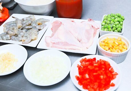 Gather the ingredients for making Spanish rice with chicken. Here are the ingredients that you'll need: 2 tbsp. olive oil 1 cup long grain rice 1 cube chicken bouillon ½ cup diced red pepper ½ cup peas ½ cup corn ¼ cup chopped onion 1 minced garlic clove 1 package tomato sauce 2 ½ cups water Salt and pepper to taste 3 chopped boneless chicken breasts 3 lbs. large shrimp