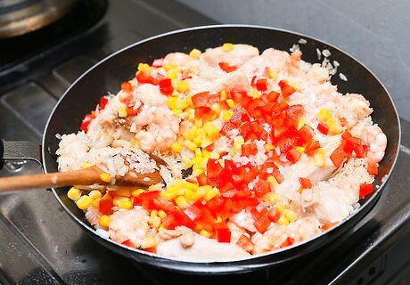 Add ¼ cup of chopped onion, 1/2 cup of corn, and 1/2 cup of diced red pepper to the mixture. Continue to stir the ingredients together.