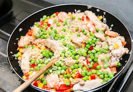 Add one minced clove of garlic and ½ cup peas to the rice. Sauté the ingredients for 1–2 minutes.