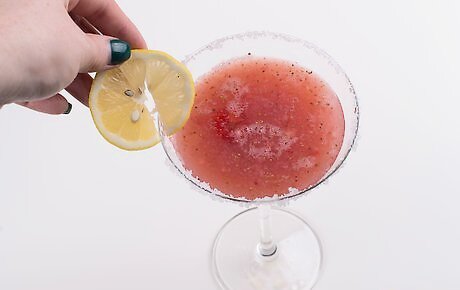 Garnish your margaritas with fruit. Since strawberry margaritas aren't as common as classic margaritas made with lime, garnish with strawberries. This way, if you're serving the cocktails to guests, they'll be able to tell what flavor the drinks are. Slice limes and strawberries thinly to float in the drinks. Since fruit won't easily float in the frozen margarita, you may want to leave the fruit whole or in larger slices. Simply cut a slit in a whole strawberry so you can set it in the rim of the glass.