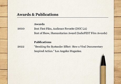 End with additional sections, like “Awards” or “Publications.” End your CV with a final flourish that shows employers your stellar mind and level of discipline. Include any awards that you received outside of academia or your professional roles as well as any articles, journals, or works you've published. Awards Best First Film, Audience Favorite (DOC LA) Best of Show, Humanitarian Award (IndieFEST Film Awards) Publications "Breaking the Bystander Effect: How a Viral Documentary Inspired Action." Los Angeles Magazine, 8 August 2022.