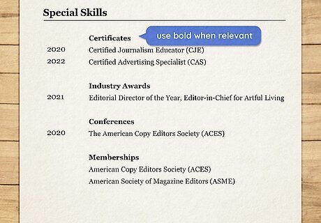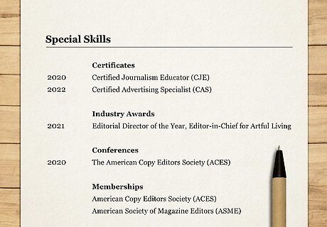 Mention any special skills of yours. If you already have work experience, showcase how you've honed your abilities in your industry—share industry awards, professional certifications, professional affiliations, conferences you've attended, or additional training you have under your belt. If you're a recent graduate or still studying, mention your hobbies and interests, projects you've involved in, and freelance work you do on the side. A seasoned professional with 11 years of experience as a magazine editor: CertificatesCertified Journalism Educator (CJE) Certified Advertising Specialist (CAS) Industry Awards Editorial Director of the Year, Editor-in-Chief for Artful Living ConferencesThe American Copy Editors Society (ACES) – 2022, 2018, 2017 Memberships American Copy Editors Society (ACES) American Society of Magazine Editors (ASME) A recent college grad with an MFA (Master in Fine Arts): Activities and Interests Fluent in Spanish and Portuguese Volunteers weekly at Home Again L.A. Member of the LA Film Society Freelances for Filmless Runs a personal blog, The Doc is in the House